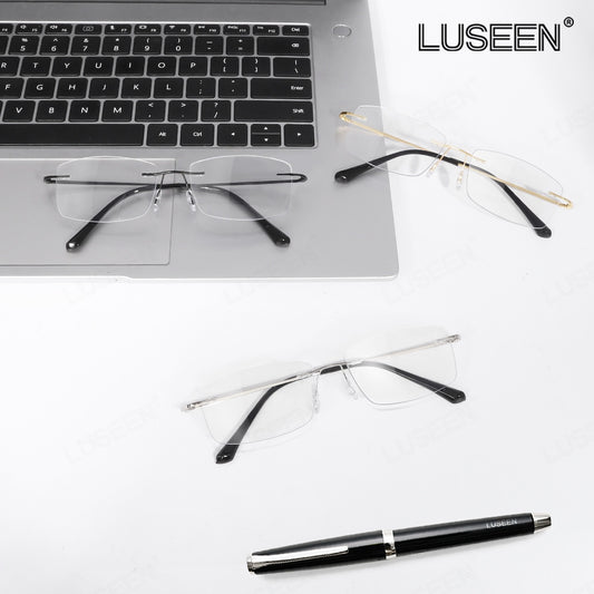 LUSEEN AG2239 Photochromic Anti-Radiation Eyeglasses Unisex Rimless Frame Black Gold Sliver